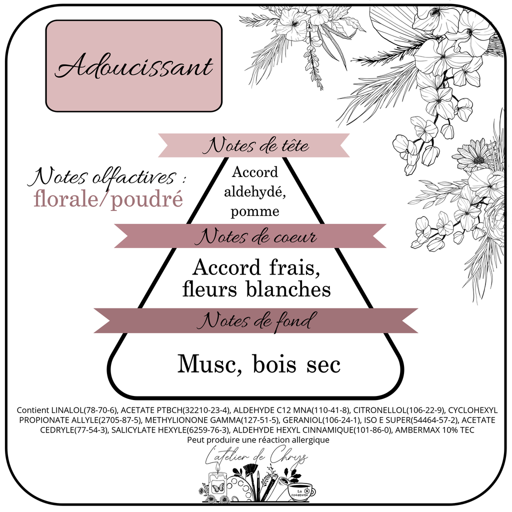 L'odeur emblématique d'un adoucissant haut de gamme. C'est une fragrance intense, légèrement musquée et profondément enveloppante, qui apporte une sensation de confort et de propreté durable à votre foyer.