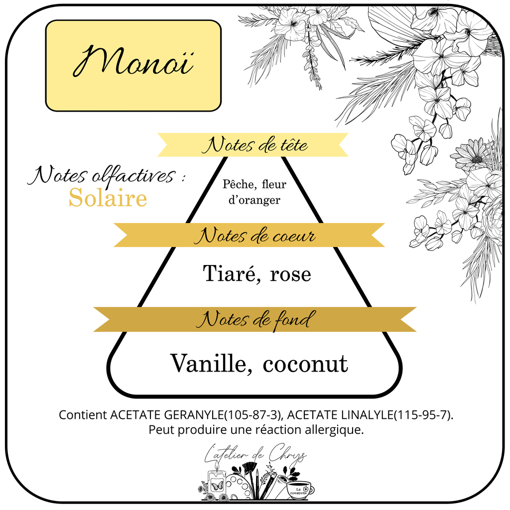 L'odeur emblématique de l'été. Le Monoï est un mélange ensoleillé de fleur de tiaré et d'huile de coco, offrant une fragrance chaude, solaire et exotique qui chasse la grisaille.